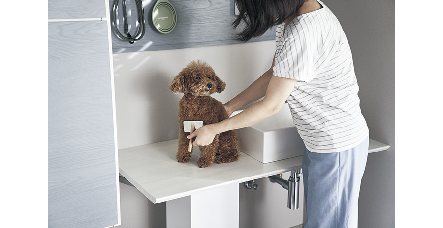 | 製品名 | わんにゃんSmileシリーズ ・インテリアカウンター耐水集成タイプ 滑り配慮塗装(くり抜き加工Uオーダー) ・カスタムパーツ マグネット対応化粧ボード ・アクアファニチャー洗面ボール、スワンネックシングルレバー、排水トラップ ・ベリティスフロアーわんにゃんSmile |